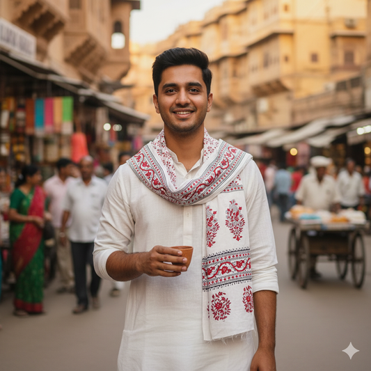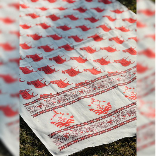 White Cotton Gamcha/Uparna with Red Cow Motif Design